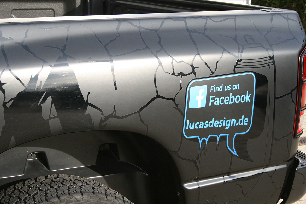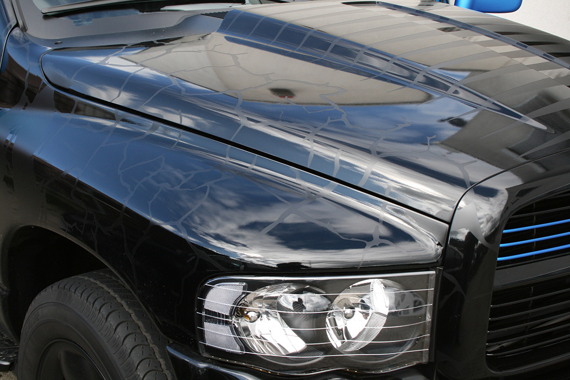 Der original schwarze Lack wurde mit einer satin matt schwarzen Folie komplett eingepackt und mit glänzend schwarzen Designelementen überzogen.